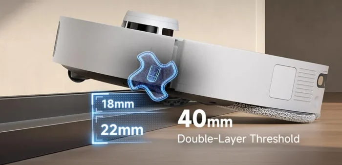 Dreame L40s Pro Ultra takler hindringer med letthet takket være sitt EasyLeap™-system med fire hjul, som lar roboten klatre over trinn og dørterskler på opptil 40 mm. Dette er en betydelig fordel i hjem med ulike terskelhøyder, og sikrer at roboten kan bevege seg fritt mellom rom uten assistanse.