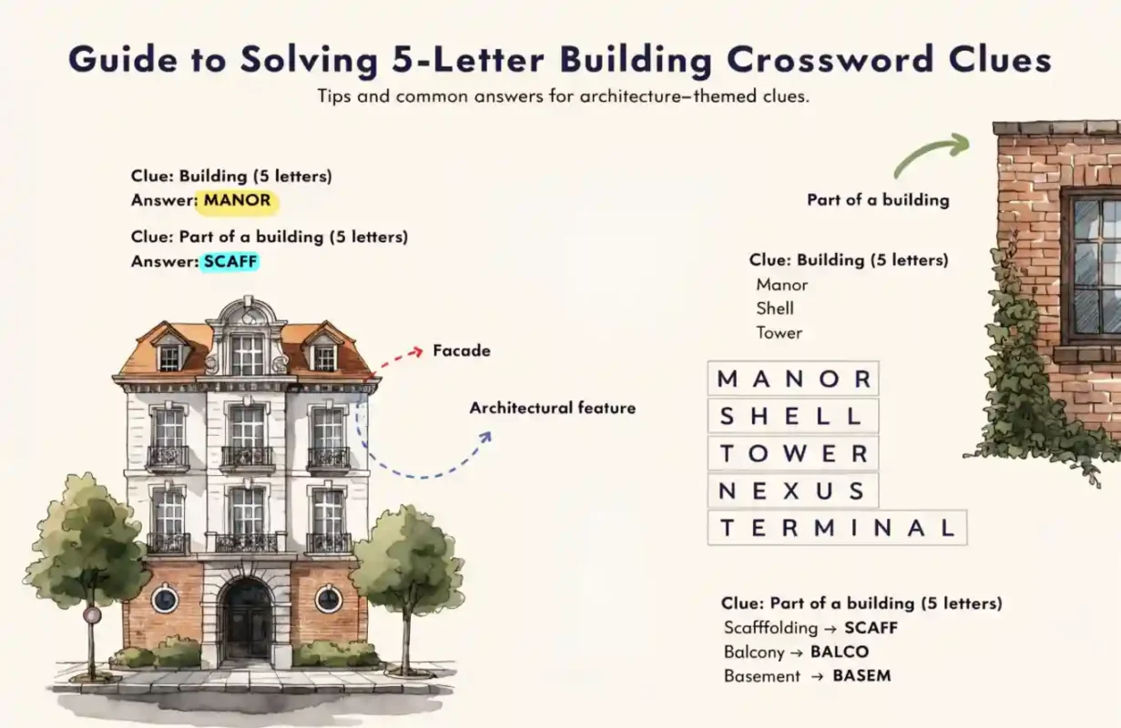 Ofte er ikke oppgaven å finne selve bygget, men en spesifikk Del av bygning kryssord. Dette kan være alt fra de store strukturene som «vegg» og «tak», til mer detaljerte arkitektoniske elementer som «gesims», «altan» eller «spire». Disse ordene er ofte vanskeligere fordi de krever teknisk innsikt i hvordan et hus faktisk er satt sammen.