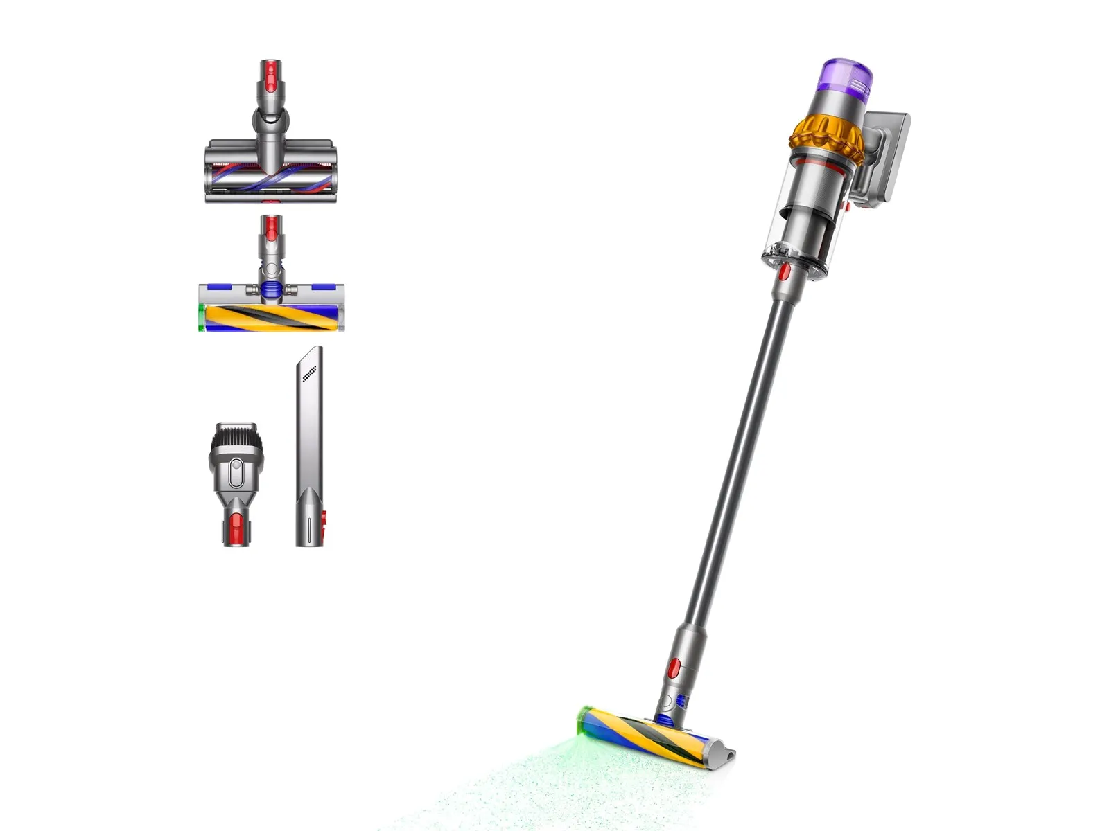 Den inkluderer Digital Motorbar, Slim Fluffy-børste, sprekk- og kombinasjonsverktøy, samt veggmontering.