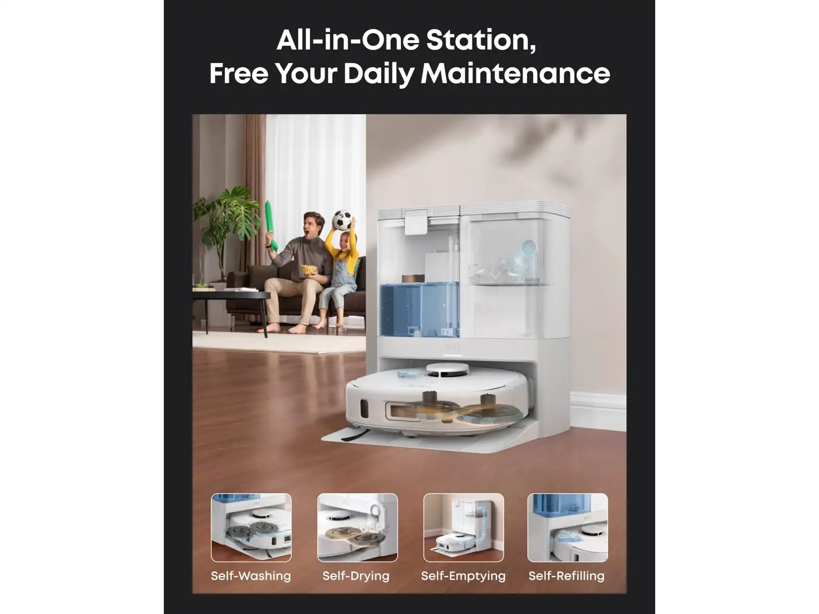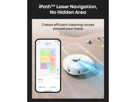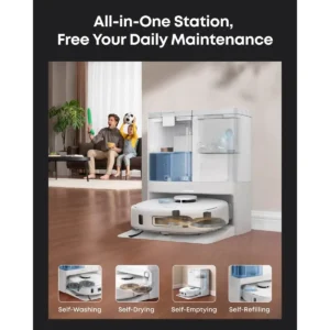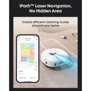 Eufy X10 Pro Omni utmerker seg med 8 000 Pa sugekraft og en trykksatt dobbelt roterende mopp som leverer grundig rengjøring. Den automatiske rengjøringsstasjonen håndterer støvtømming, moppvask og tørking, mens den 3 l rentvannstanken støtter mopping av opptil 150 m². AI.See hindringsunngåelse og iPathTM laser-navigasjon sikrer presis rengjøring, og moppeløft-funksjonen beskytter tæpper.