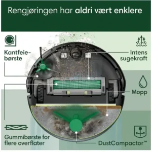 Roomba 205 DustCompactor revolusjonerer rengjøringen i norske hjem med sin innovative støvkraft og plassbesparende design. Denne smarte robotstøvsugeren kombinerer kraftig suging med mopping, og komprimerer avfall i opptil 60 dager uten tømming. Med LiDAR-navigasjon og app-styring blir gulvene dine skinnende rene, selv i mørket. Den er perfekt for travle familier som ønsker mer fritid.