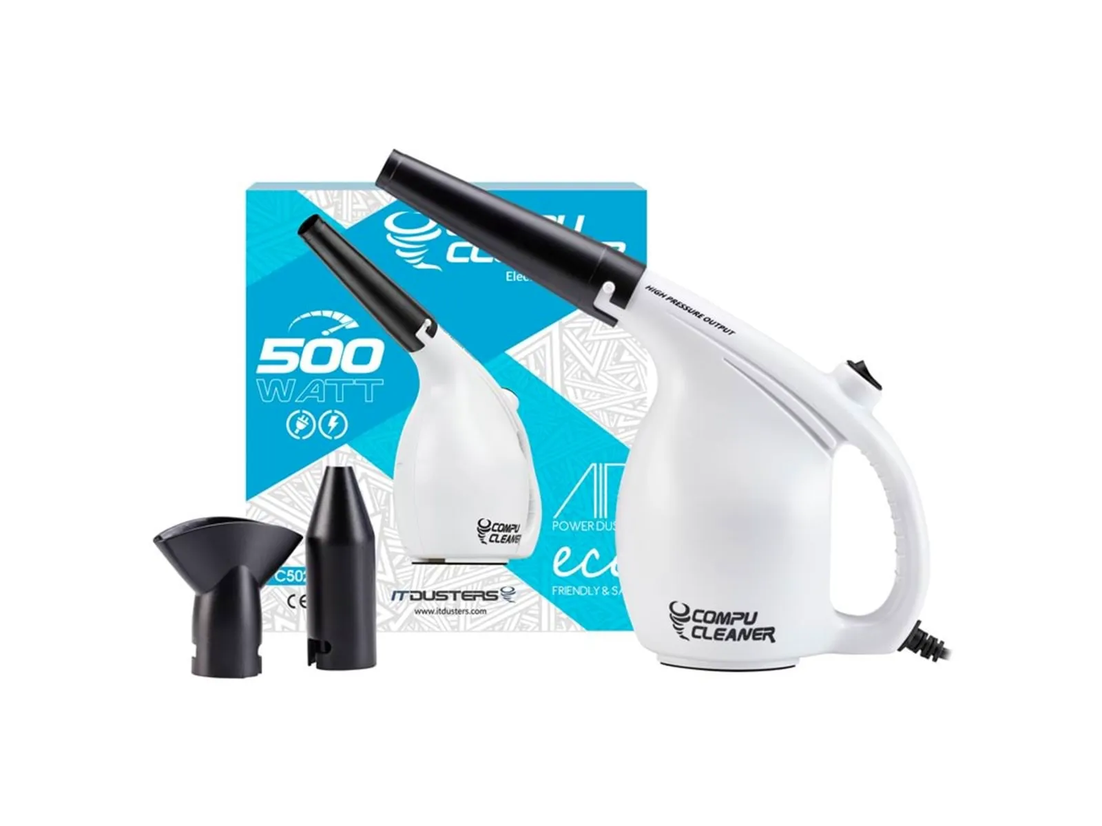 IT Dusters CompuCleaner Original 2 er designet for å fjerne støv fra elektronikk uten risiko for skade. Vi testet denne luftblåseren på datamaskiner, skrivere og sensitive overflater, og ble imponert over dens 500 W motor som leverer jevn og kraftig luftstrøm. De seks munnstykkene gir presis kontroll over luftretningen. Ifølge resultatene fra testene, håndterer den støv og rusk effektivt i trange områder.
