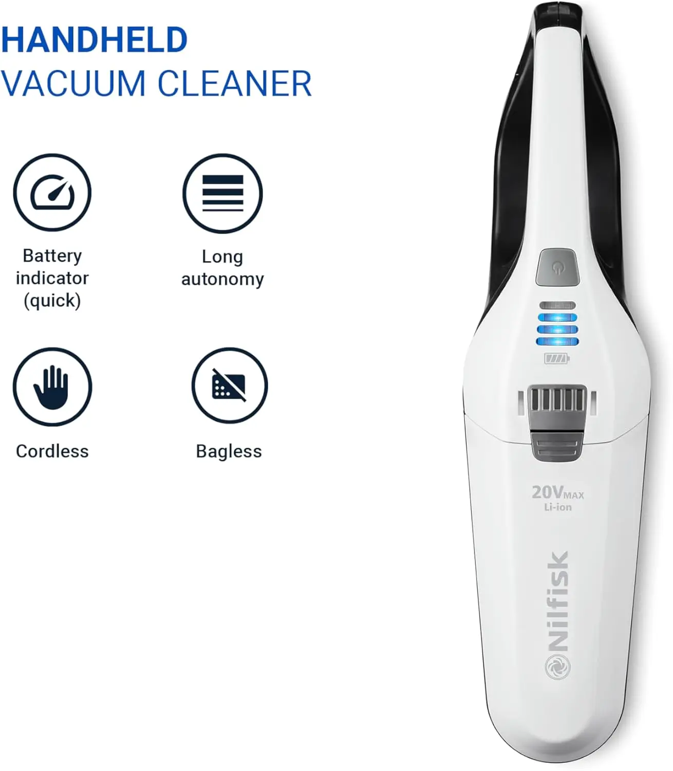 Nilfisk Quick 20VMAX fokuserer på essensielle funksjoner for håndholdt bruk. Her er spesifikasjonene oversiktlig.