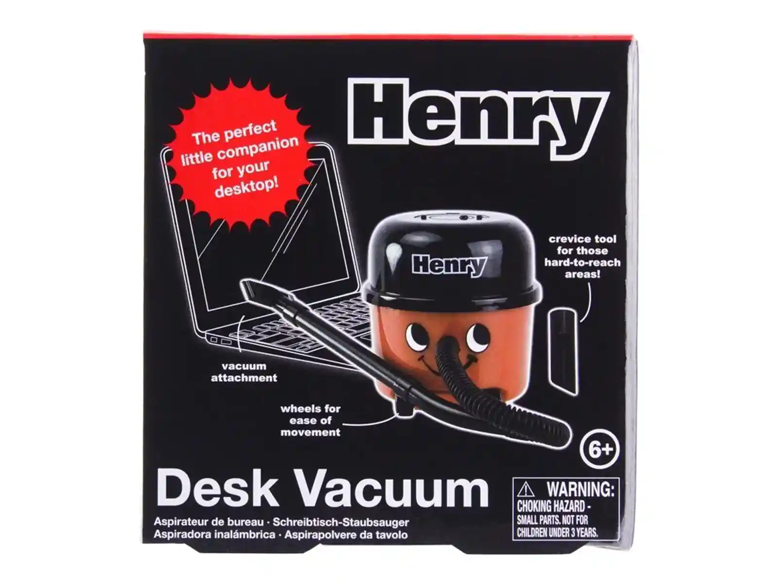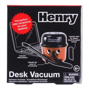 Paladone Henry Desk Vacuum er en sjarmerende mini støvsuger designet for skrivebord og arbeidsplasser i norske hjem og kontorer. Denne ikoniske, miniatyrversjonen av den klassiske Henry Hoover veier nesten ingenting og fjerner smuler og støv effektivt med sin lille sugehode og sprekkeverktøy. Med en høyde på bare 10 cm passer den perfekt inn i trange rom, og batteridrift gir enkel mobilitet uten kabler.