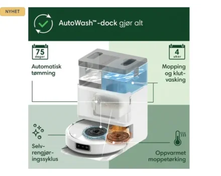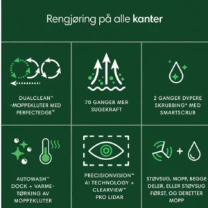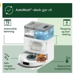 - 🚀 Automatisk dock håndterer tømming og moppevask i uker