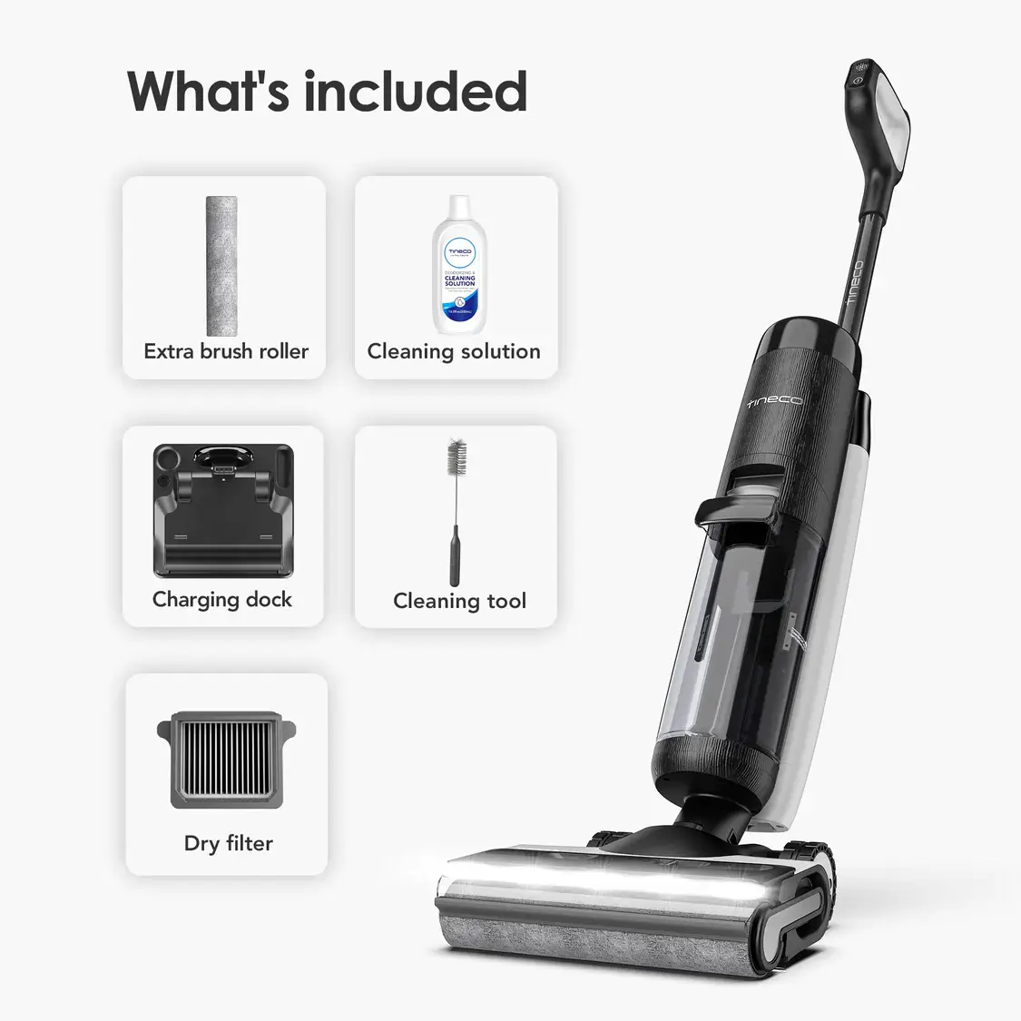 - Inkludert tilbehør: 2 rullebørster, opladningsstasjon, strømadapter, 2 HEPA-filtre, renseverktøy