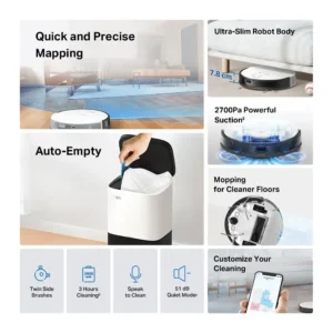 Robotstøvsugere med auto-empty som denne tilbyr hands-free, mens LiDAR sikrer nøyaktighet. Sugekraft påvirker oppsamling, filter allergivennlighet, og posekapasitet vedlikehold – essensielt for norske brukere med harde gulv og tepper.