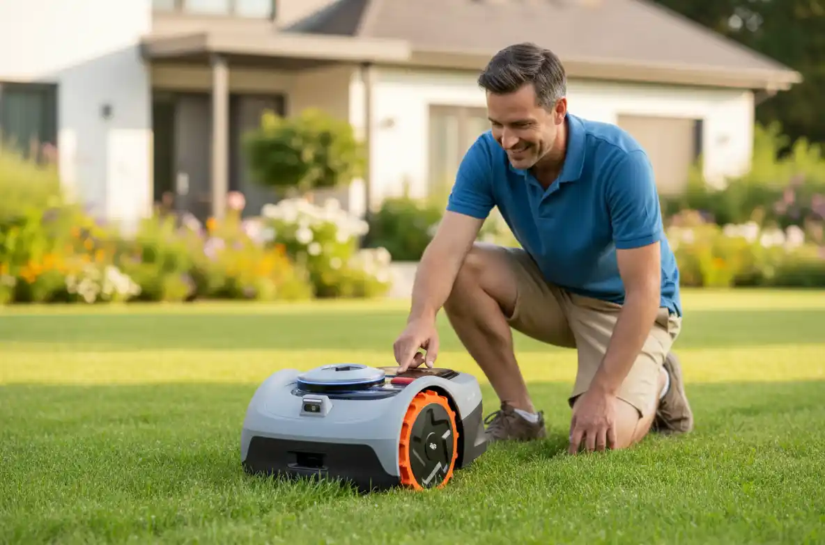 En småhageeier setter opp klipping via appen før en helgetur. Doble kniver sikrer jevn plen, og regnsensorer stopper drift i dårlig vær. Robotten tilpasser seg hagens form.