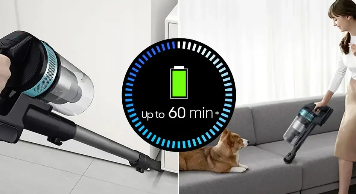Forestil deg at du skal rengjøre et stort hus etter en fest. Med Samsung Jet 75E Pet kan du enkelt bytte mellom ulike børster og moduser, fra Turbo Action Brush for tepper til Soft Action Brush for harde gulv. Den lange batterilevetiden på opptil 60 minutter gir deg rikelig med tid til å fullføre oppgaven uten å måtte lade midtveis. Dette gjør rengjøringen mer strømlinjeformet og mindre tidkrevende, slik at du får mer tid til det som betyr mest.